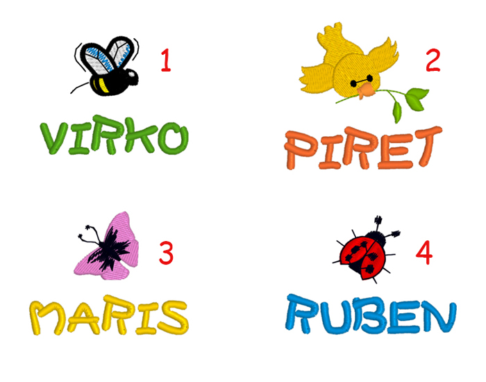 | Nime värv | hall, helehall, helelilla, helepruun, heleroheline, kollane, kuldne kollane, lilla, must, oranź, pruun, punane, roosa, sinine, tume vanaroosa, tumehall, tumepruun, tumepunane, tumeroheline, tumeroosa, tumesinine, valge, vanaroosa |