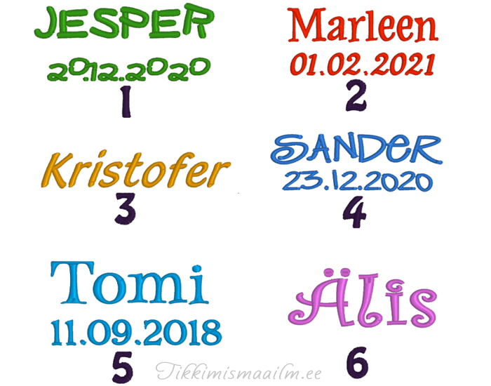| Nime värv | hall, helehall, helelilla, helepruun, heleroheline, kollane, kuldne kollane, lilla, must, oranź, pruun, punane, roosa, sinine, tume vanaroosa, tumehall, tumepruun, tumepunane, tumeroheline, tumeroosa, tumesinine, valge, vanaroosa |