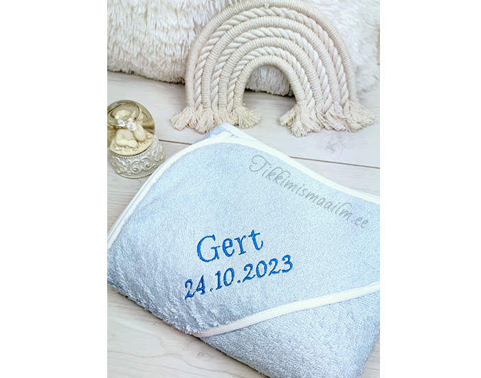 Telli beebi nimi või nimi koos sünniandmetega vannirätikule. Vannilina on ideaalne valik igapäevaseks kasutamiseks. Beebi nime tikand lisab vannilinale isikupära ning teeb sellest suurepärase kingituse ktsikuteks.